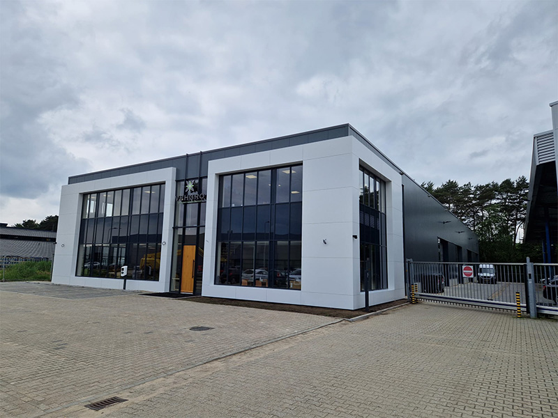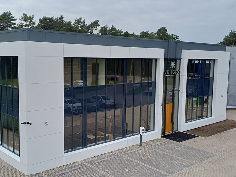 Dankzij de strakke afwerking en de robuuste eigenschappen van het aluminium composiet is het gebouw niet alleen esthetisch aantrekkelijk, maar ook bestand tegen diverse weersinvloeden.